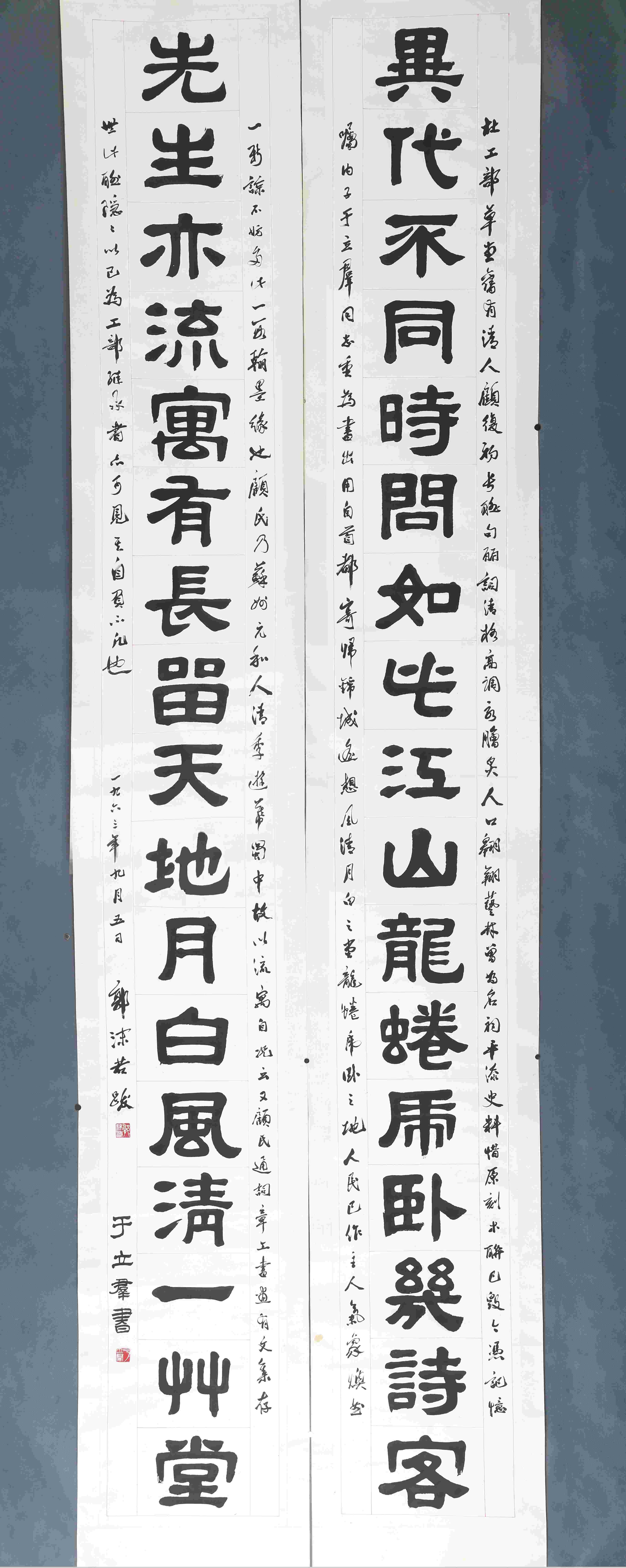1963年于立群隶书异代不同时问如此江山龙蜷虎卧几诗客对联