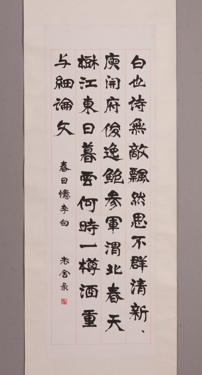 1963年老舍隶书春日忆李白字轴