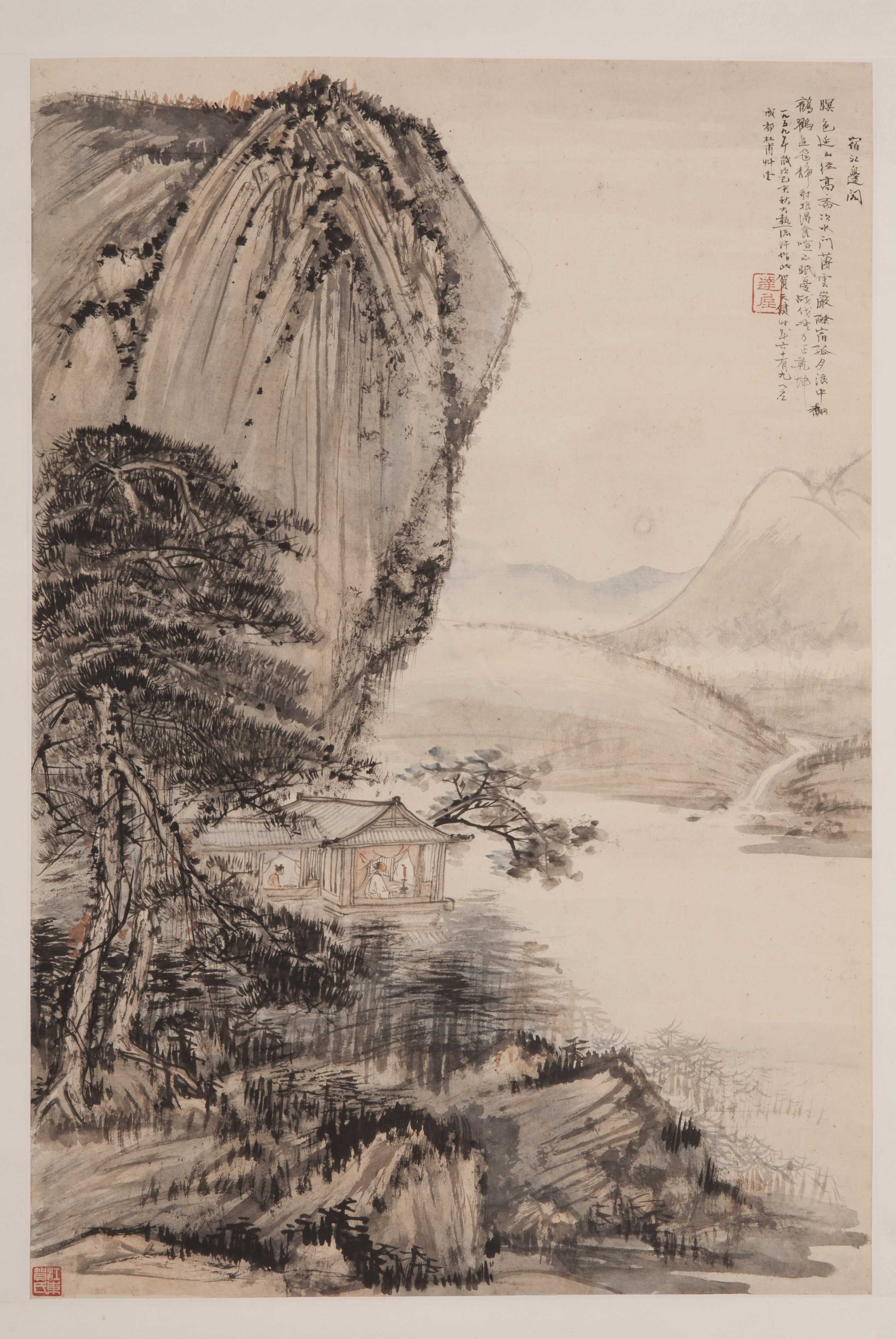 1959年贺天健宿江边阁山水图轴