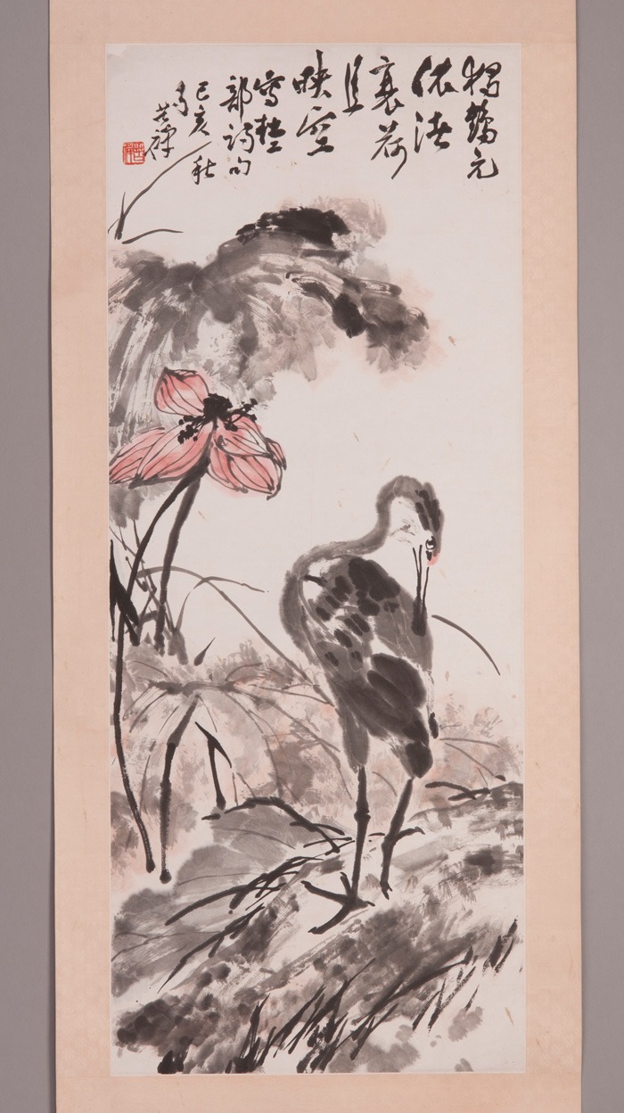 1959年李苦禅陪郑公秋晚北池临眺独鹤图轴
